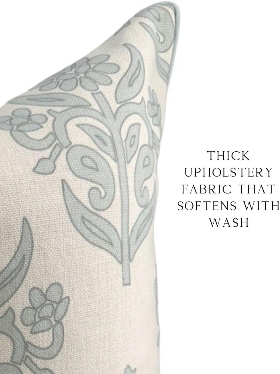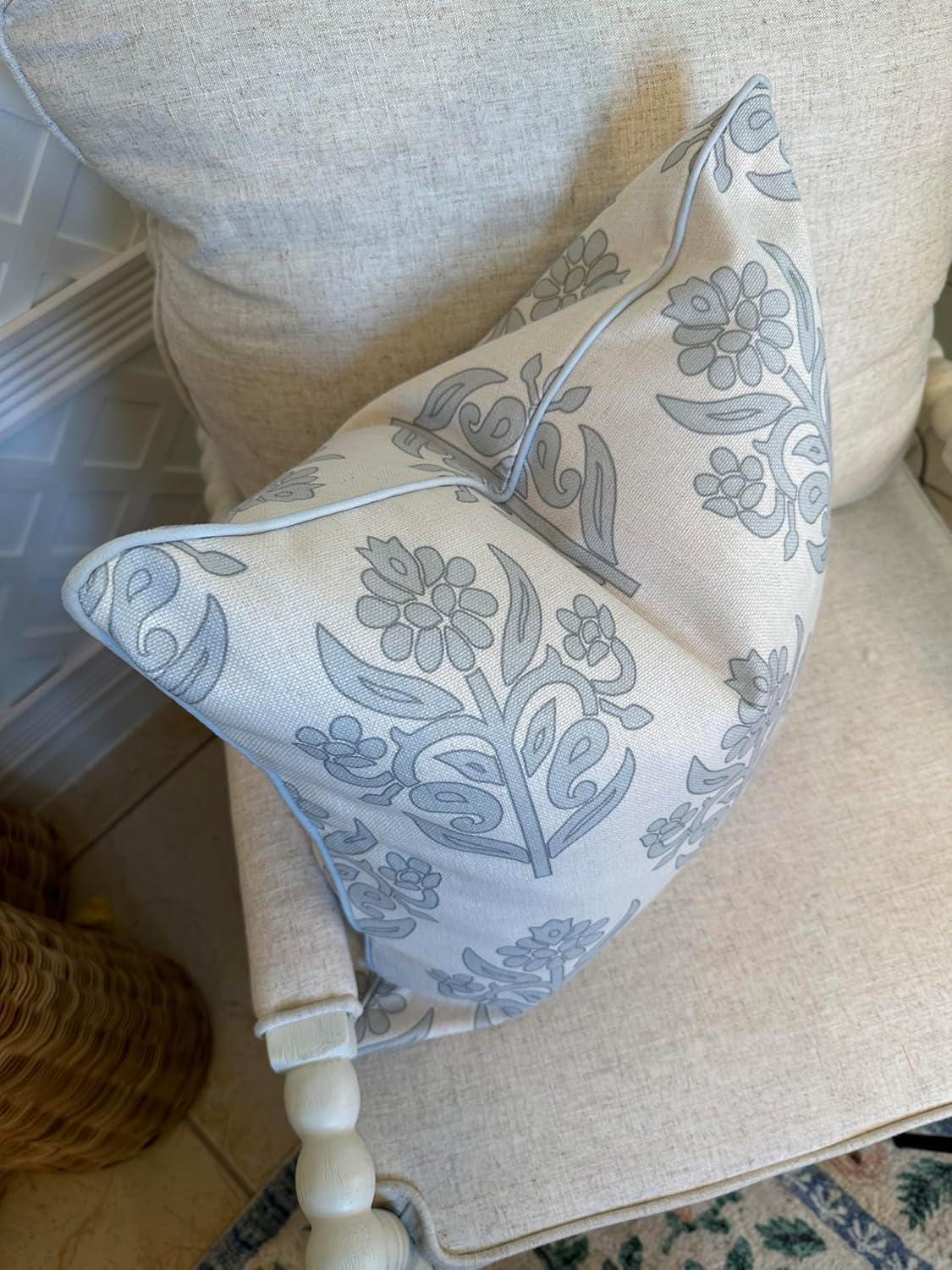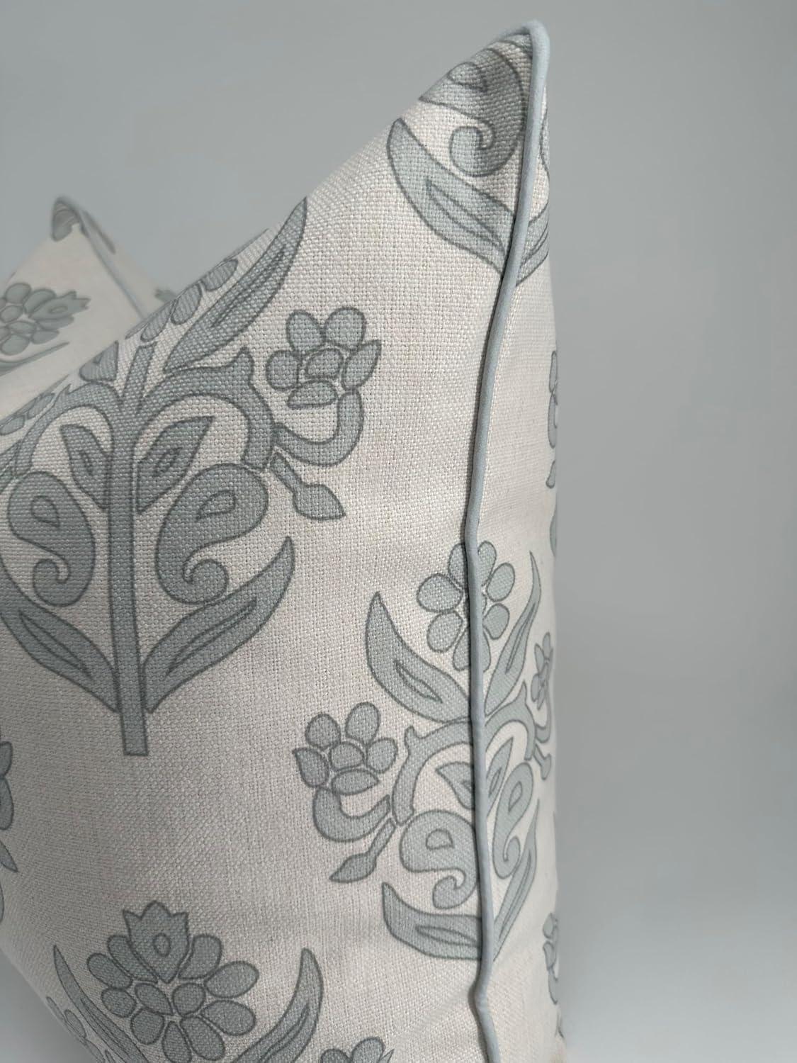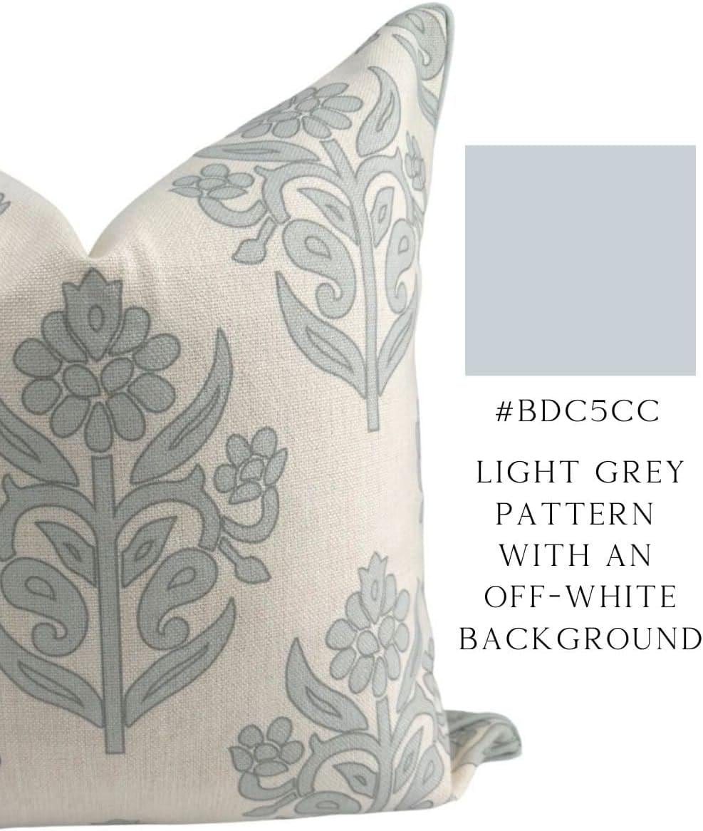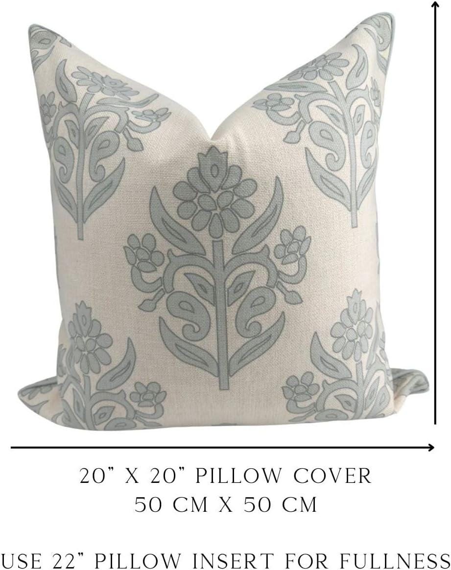 Meet the Naples pillow—an effortlessly elegant addition to your Grandmillennial home. This 20"x20" pillow cover features a soft grey block print floral pattern on an off-white background, accented with refined grey-blue piping for a clean, tailored finish. The floral print is a close match to hex color #BDC5CC—please see product images and video for swatches and color accuracy, and adjust your screen’s brightness if needed to ensure a true-to-life match. Crafted from a high-quality poly-cotton blended upholstery fabric, the Naples pillow is both durable and soft, designed to become even cozier over time. With a double-sided design and concealed zipper, it’s as functional as it is beautiful—perfect for styling your living room, bedroom, or home office. Spot clean recommended, or machine wash cold separately and lay flat to dry. Do not iron. Insert not included—we recommend our 22" insert for the perfect plush look for the 20" Naples.