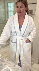 - Soft Blue Piping Detail: Accented with elegant, soft blue piping along the shawl collar, cuffs, and pockets, this robe adds a sophisticated, classic touch to your everyday relaxation routine.