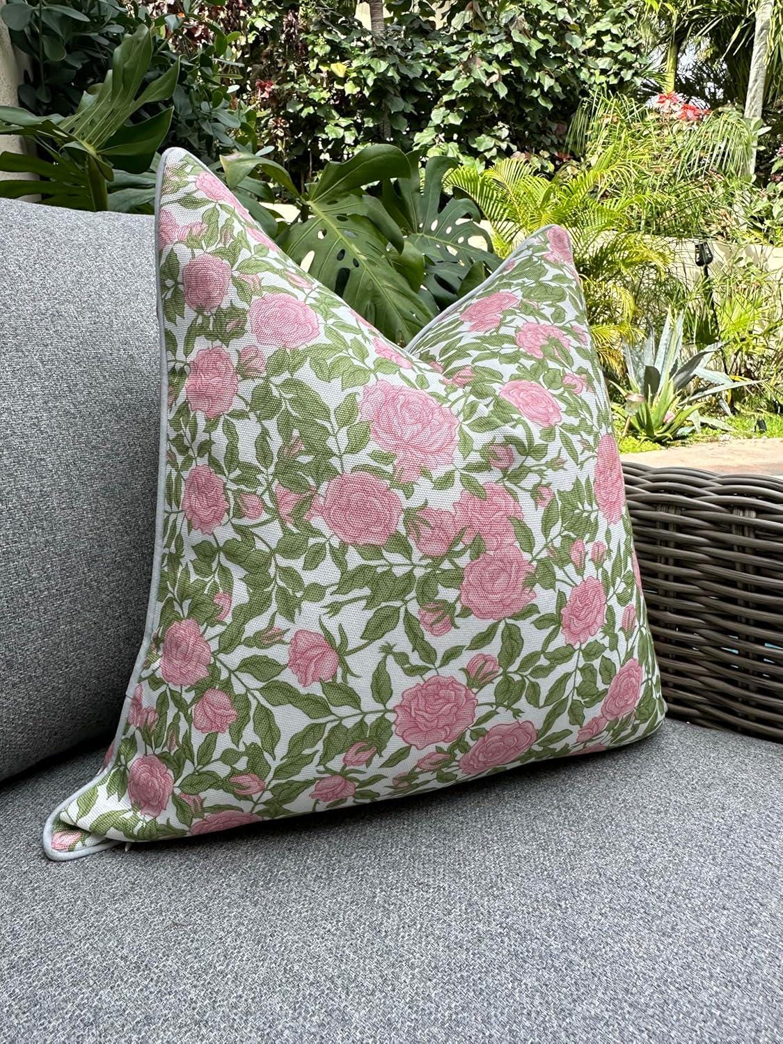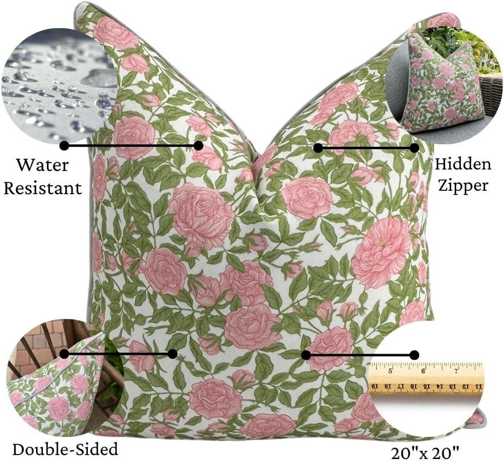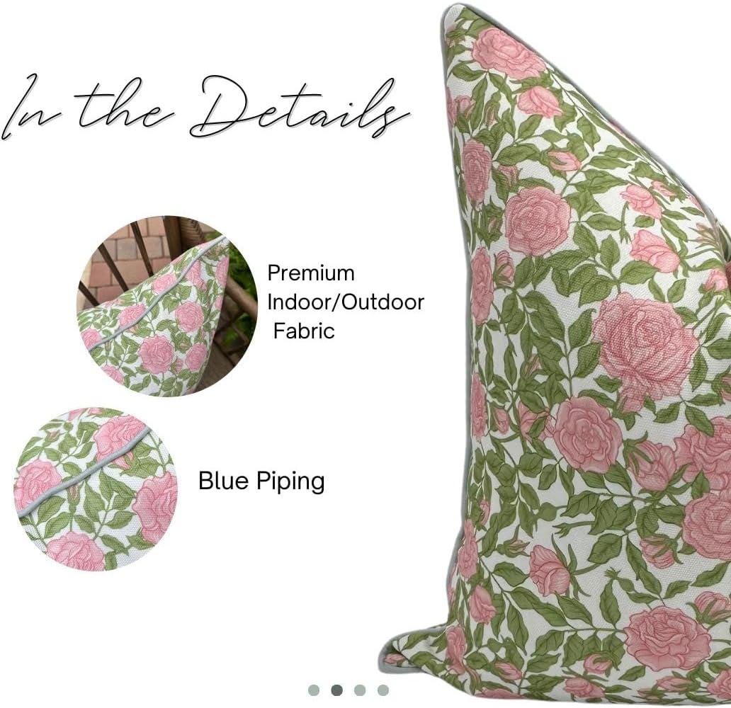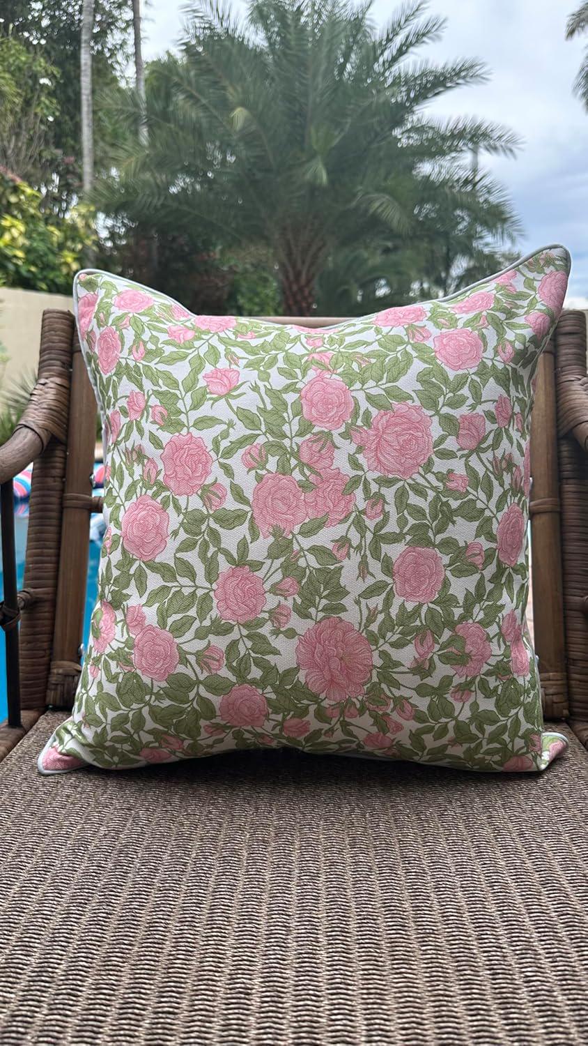 Meet the Olivia pillow—our outdoor-ready cover that brings classic Grandmillennial charm to your patio, porch, or garden seating. Designed with a romantic rose pattern and a nod to Palm Beach style, this 20"x20" pillow cover is both beautiful and functional. Made from a durable poly-cotton blend upholstery fabric, it’s soft to the touch yet tested for durability against moisture and sunlight in our Miami, FL home. While the fabric is water-resistant, we recommend bringing it inside during rain and avoiding prolonged direct sun to keep it looking its best. The Olivia features a double-sided design, hidden zipper, and elegant finish—making it a standout on its own or when paired with our Cabana or Alys pillows for a cohesive, styled outdoor space. It also makes a thoughtful gift for housewarmings, graduations, or anyone who loves a beautifully curated home. Spot clean or machine wash cold separately and lay flat to dry. Do not iron. Insert not included; we recommend a 22" insert for the perfect fit.