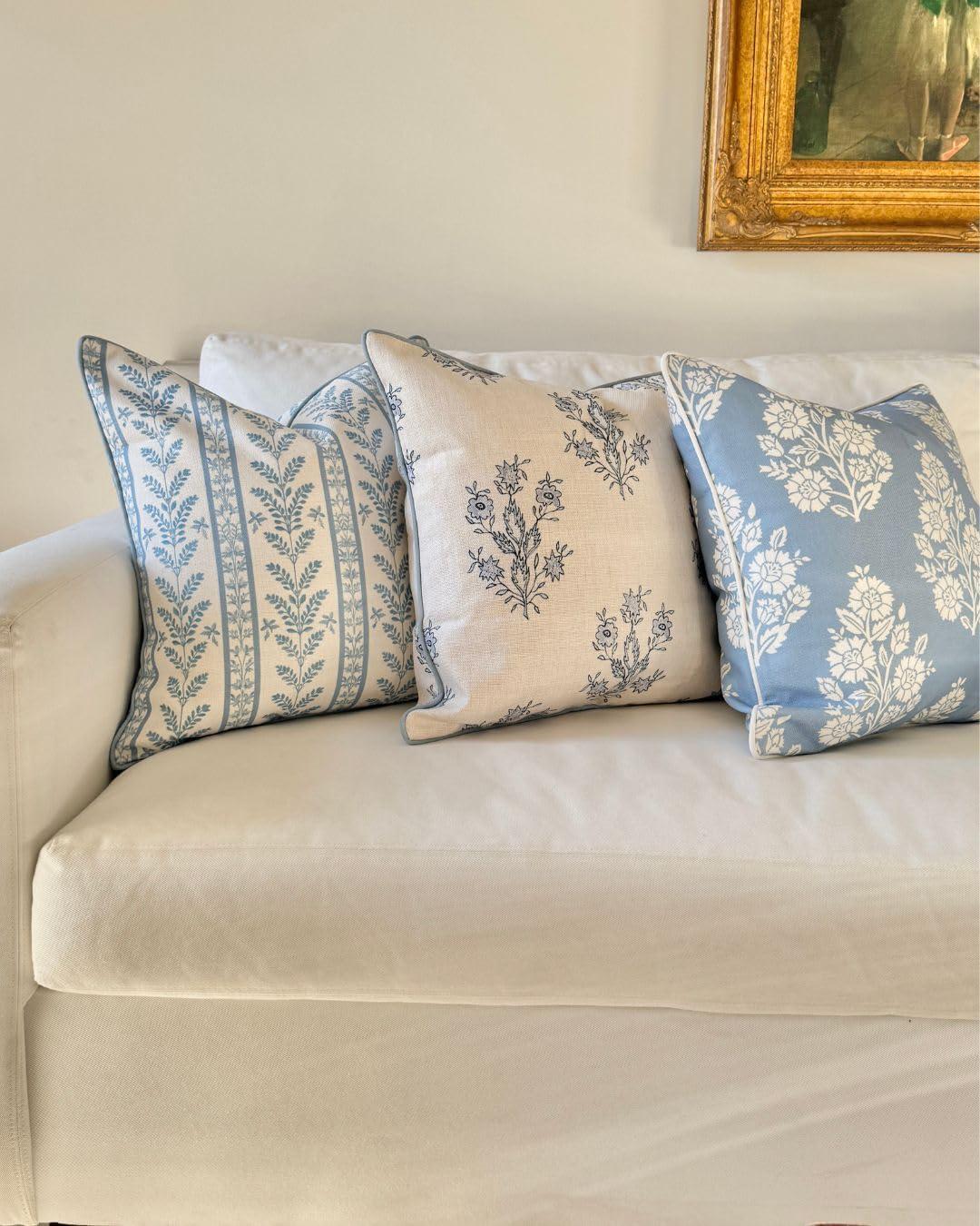 Our Hazel pillow cover is a standout in our collection, featuring a soft blue background (a close match to Pantone 15-4005 Pearl Blue) with white block print florals and crisp white piping for a fresh, Grandmillennial look. Measuring 20"x20", it’s the perfect size to style on your sofa, bed, or favorite reading chair. Crafted from a durable poly-cotton blended upholstery fabric that softens with washing, the Hazel pillow is double-sided, offering beauty and versatility from every angle. A hidden zipper ensures your insert stays snug while keeping the overall design clean and polished. Whether you're refreshing your space or gifting someone who loves classic interiors, Hazel makes a thoughtful choice. Spot clean recommended, or machine wash cold separately and lay flat to dry. Do not iron. Insert not included—we recommend our 22" insert for a full, plush look.