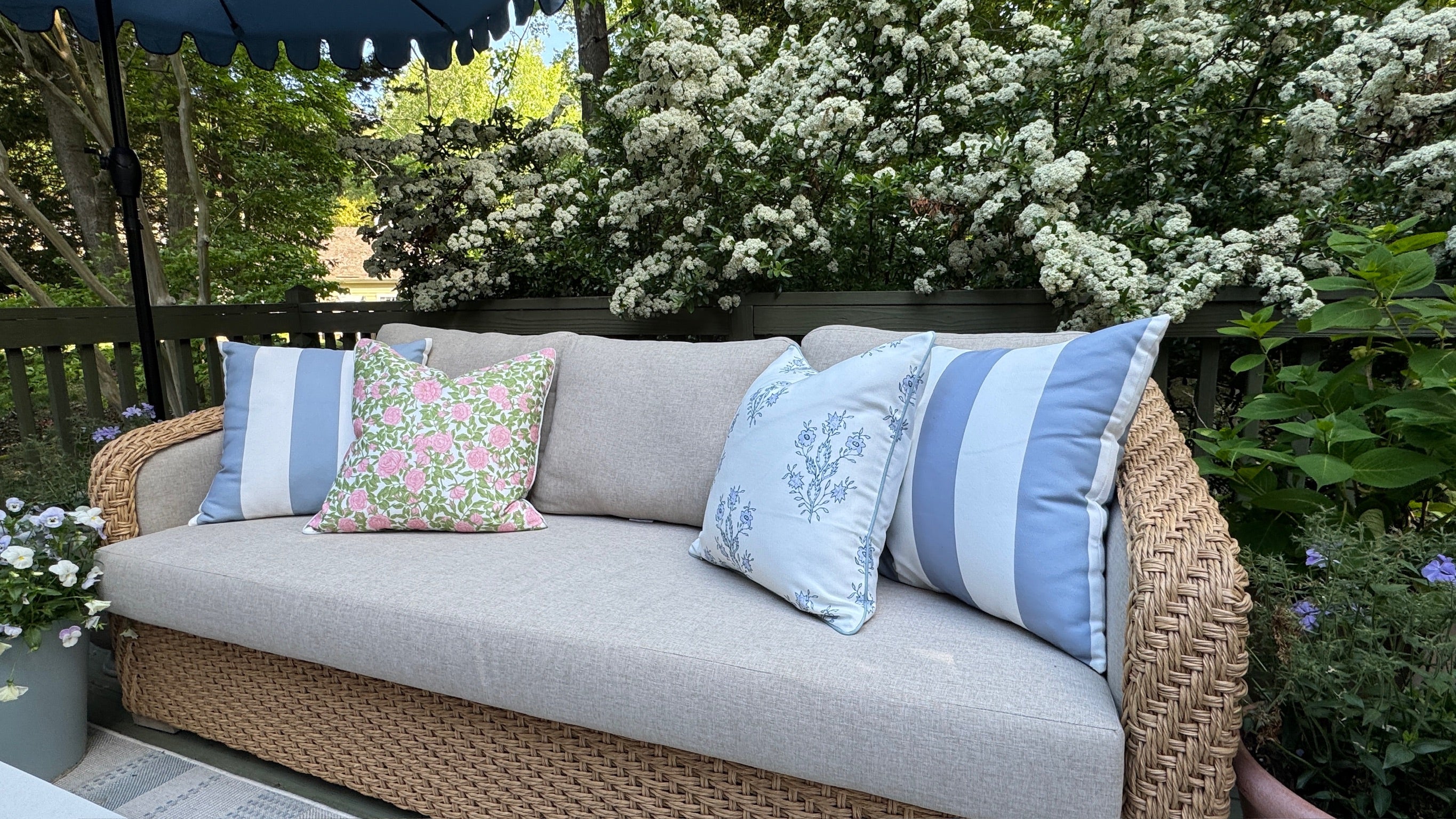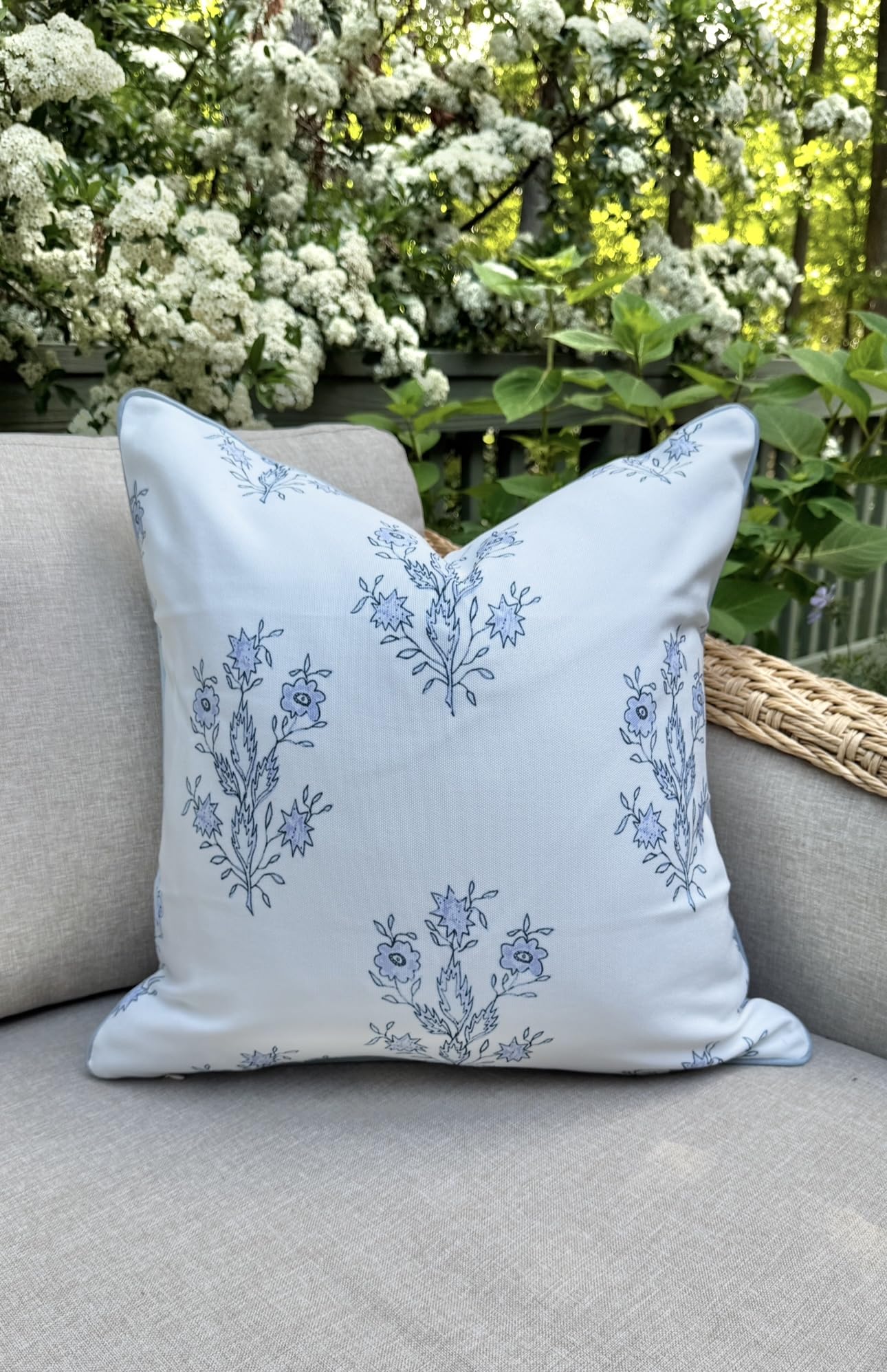 The Mary pillow cover brings Grandmillennial charm to your outdoor spaces with its soft periwinkle floral pattern and classic piping detail. Measuring 20" x 20", it features a white background with delicate blue flowers and light blue piping (similar to hex #8c9eab) for a polished, high-end look.