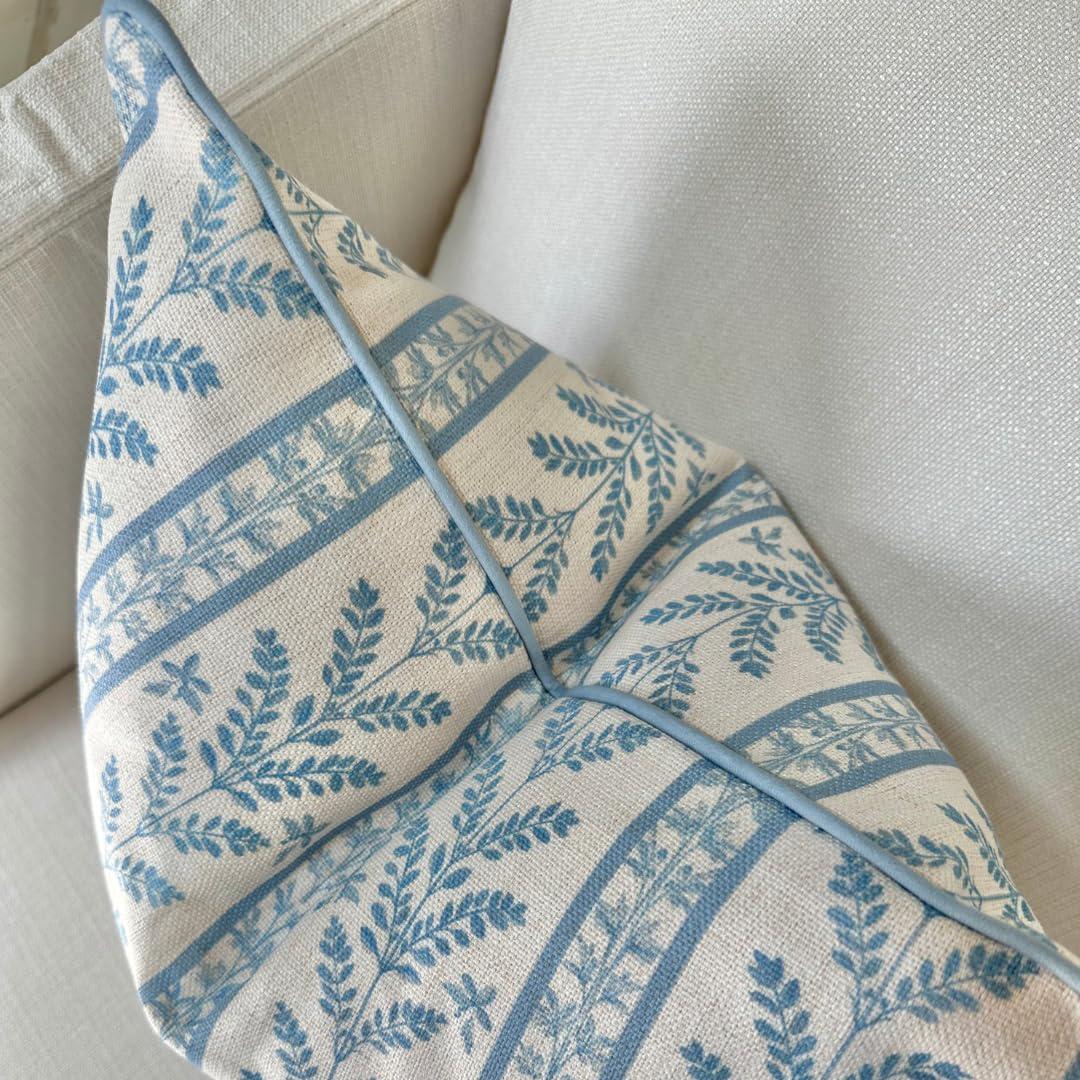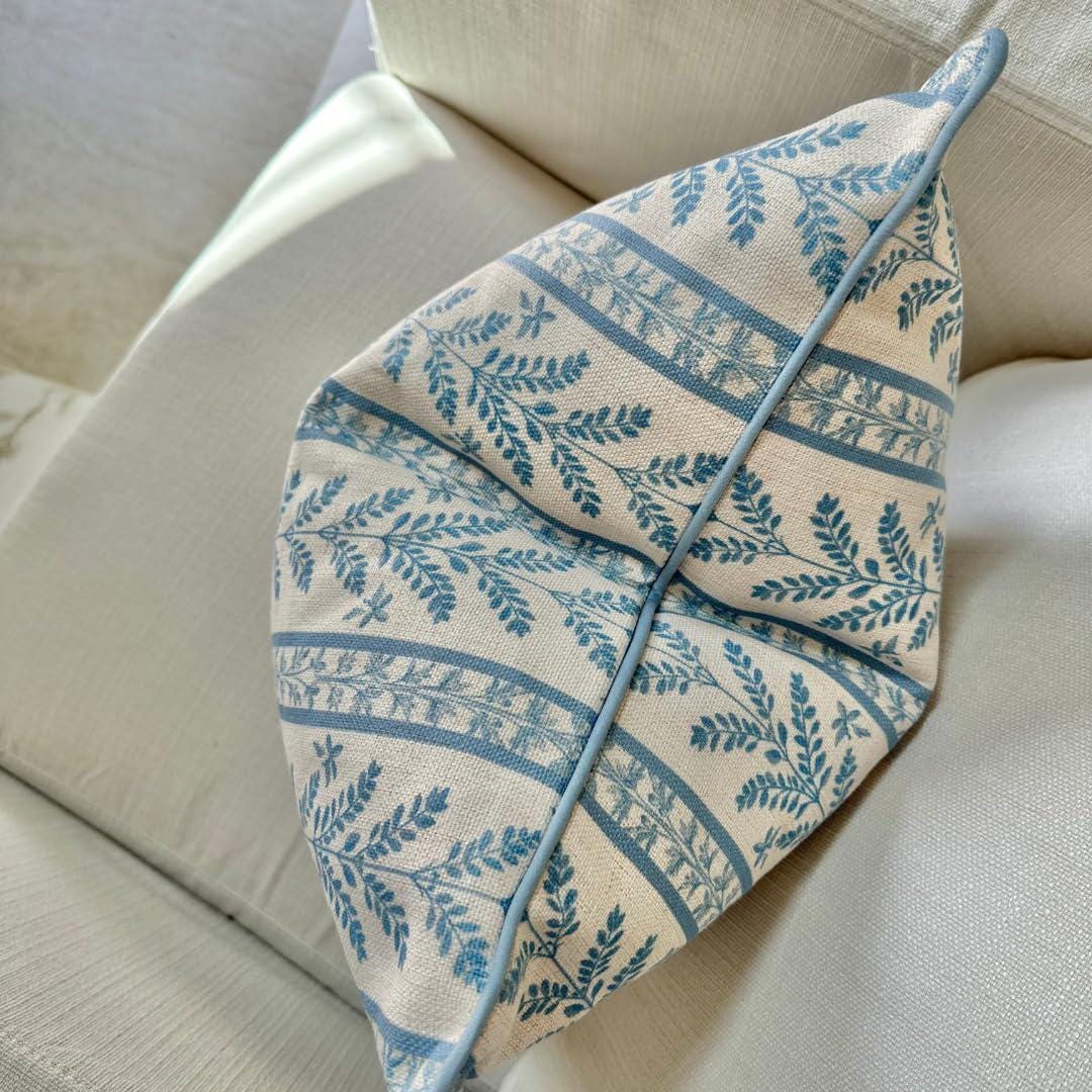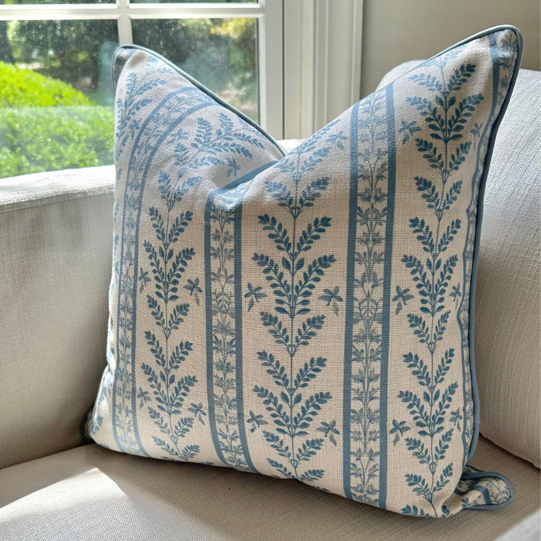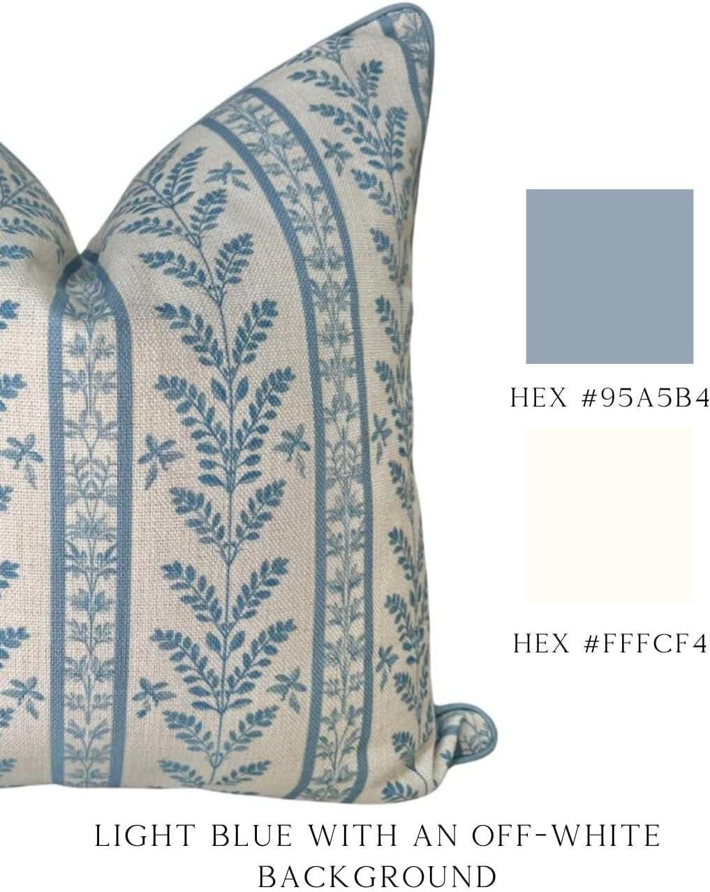 Meet the Louis pillow—an elegant, airy design that brings subtle charm and Grandmillennial style to any room. This 20"x20" pillow cover features a soft light blue leaf pattern on an off-white background, accented with matching blue-grey piping for a refined, designer touch.